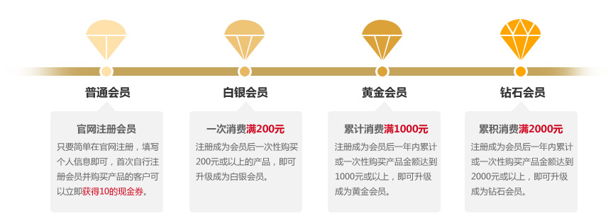 佰花方分別有四個(gè)等級(jí),即普通會(huì)員、白銀會(huì)員、黃金會(huì)員、鉆石會(huì)員: